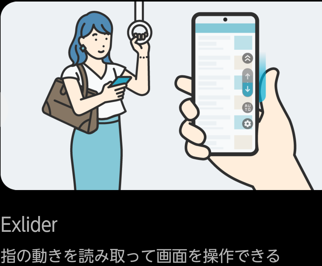 Exlider機能。電源ボタンに指を当てて上下に指を上げたり下げたりすると画面がスクロールします。ゆっくりと画面を動かせるので文章等を読む時に使える機能です