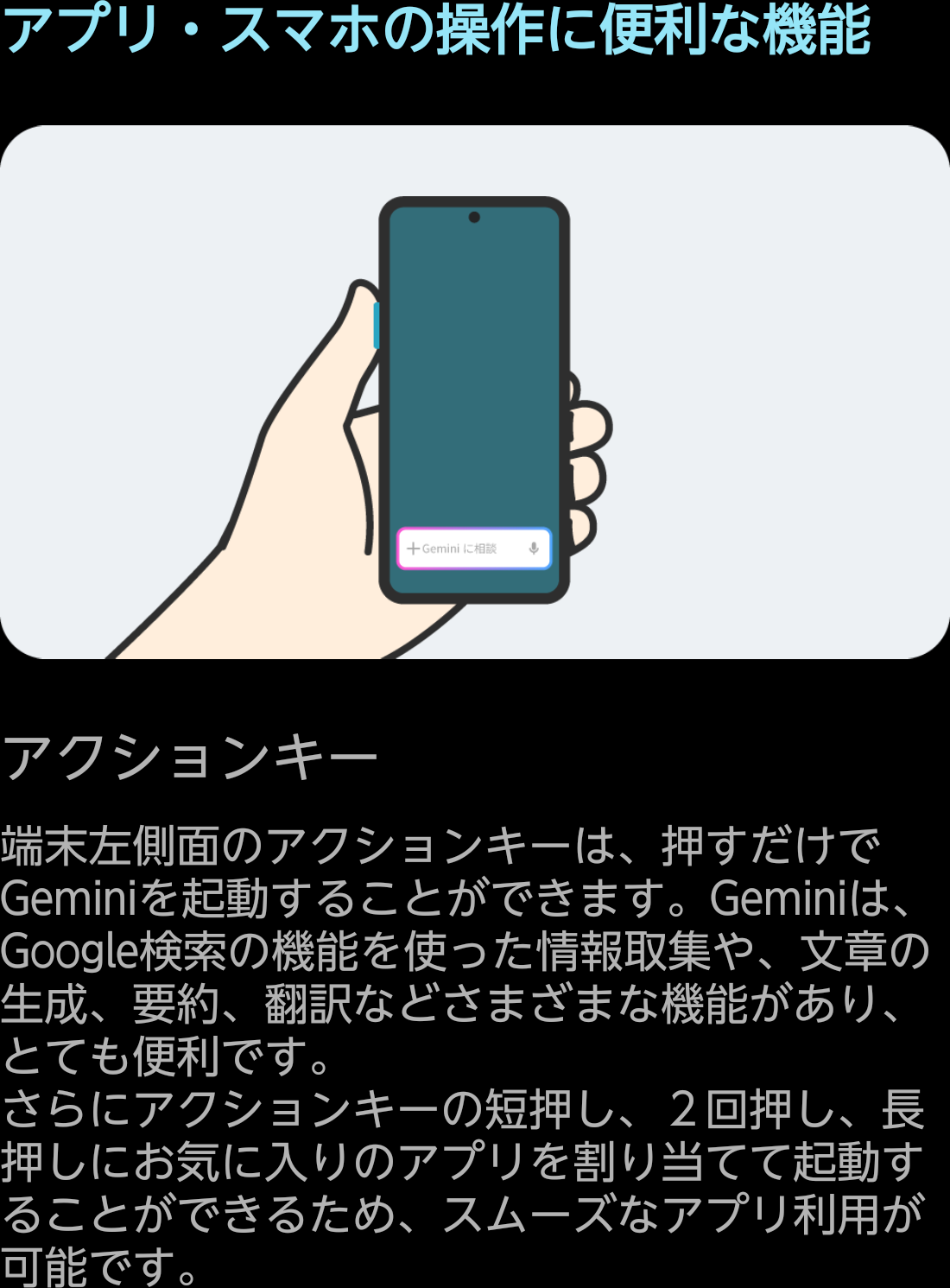 目新しい機能ではありませんが、物理ボタンにアクションキーが左側面にあるので。ロックを外さずにカメラ機能やボイスレコーダー等を使えます