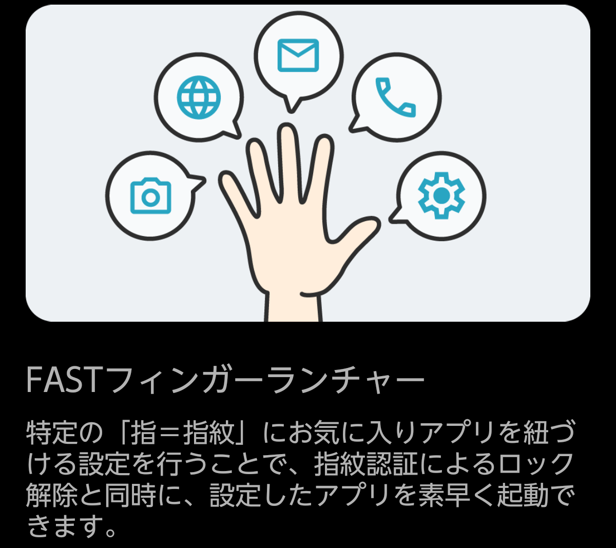 呼び出し系も揃っています。自分は指紋のフィンガーランチャーを使っていますね。メリットは毎回同じ事をする場合に早くアプリを起動させる事が出来ます