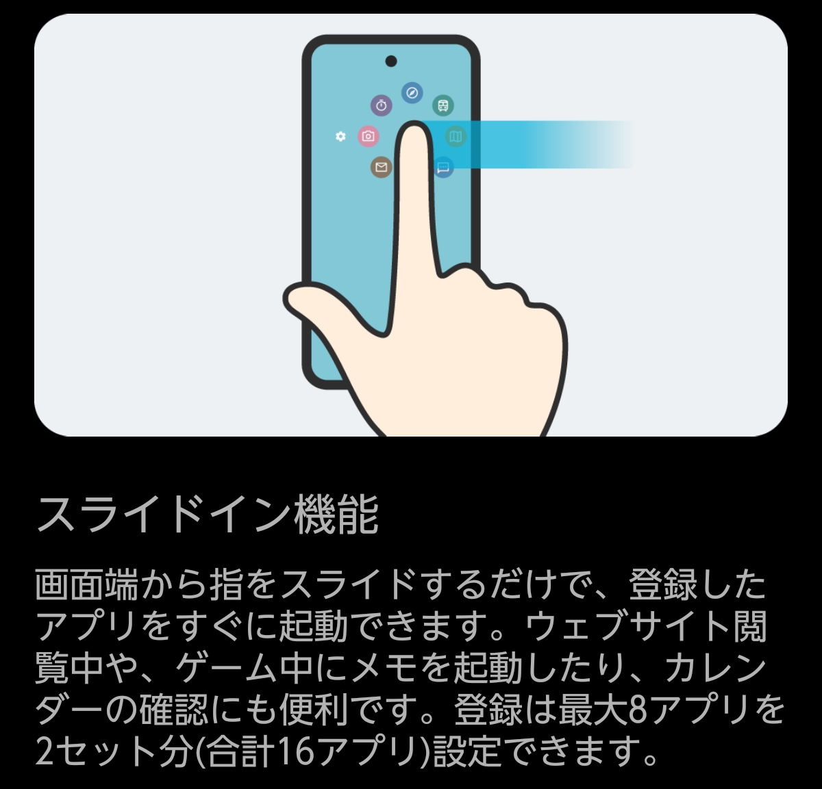 Exlider機能は右手でスマホを持つ人専用なのが残念です。一応左手で持ち薬指で操作は出来ますが普通に右手で画面をスワイプした方が良いので人を選ぶ機能です