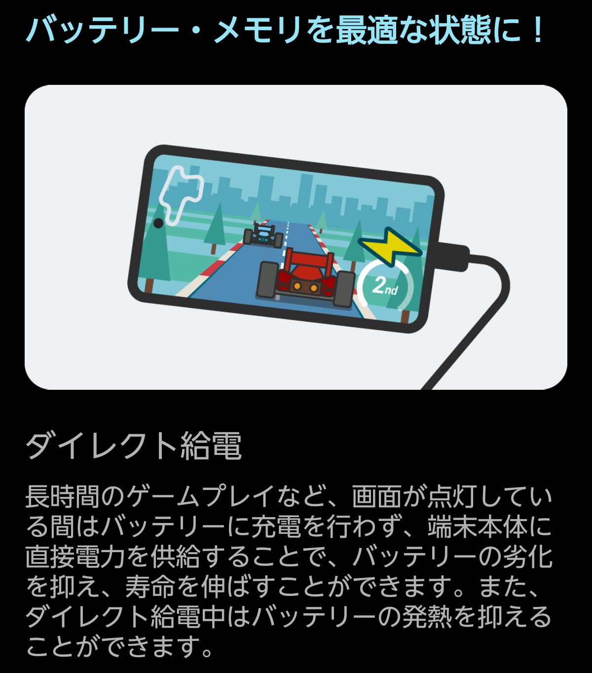 ゲーミングスマホに良く付いている機能のダイレクト給電にも対応しています。長時間プレイをするゲーム等の場合バッテリーには給電せずにスマホ本体に電気を送るので、バッテリーの劣化を防げます
